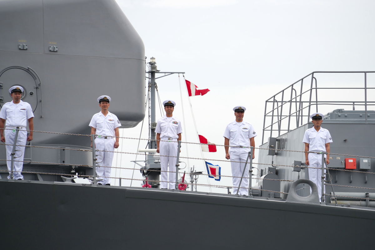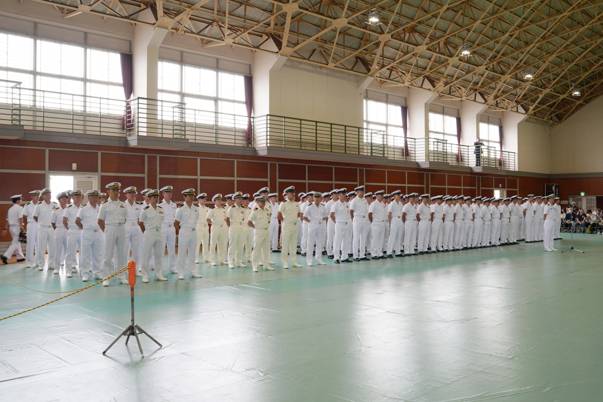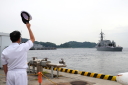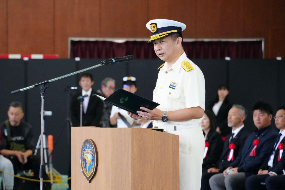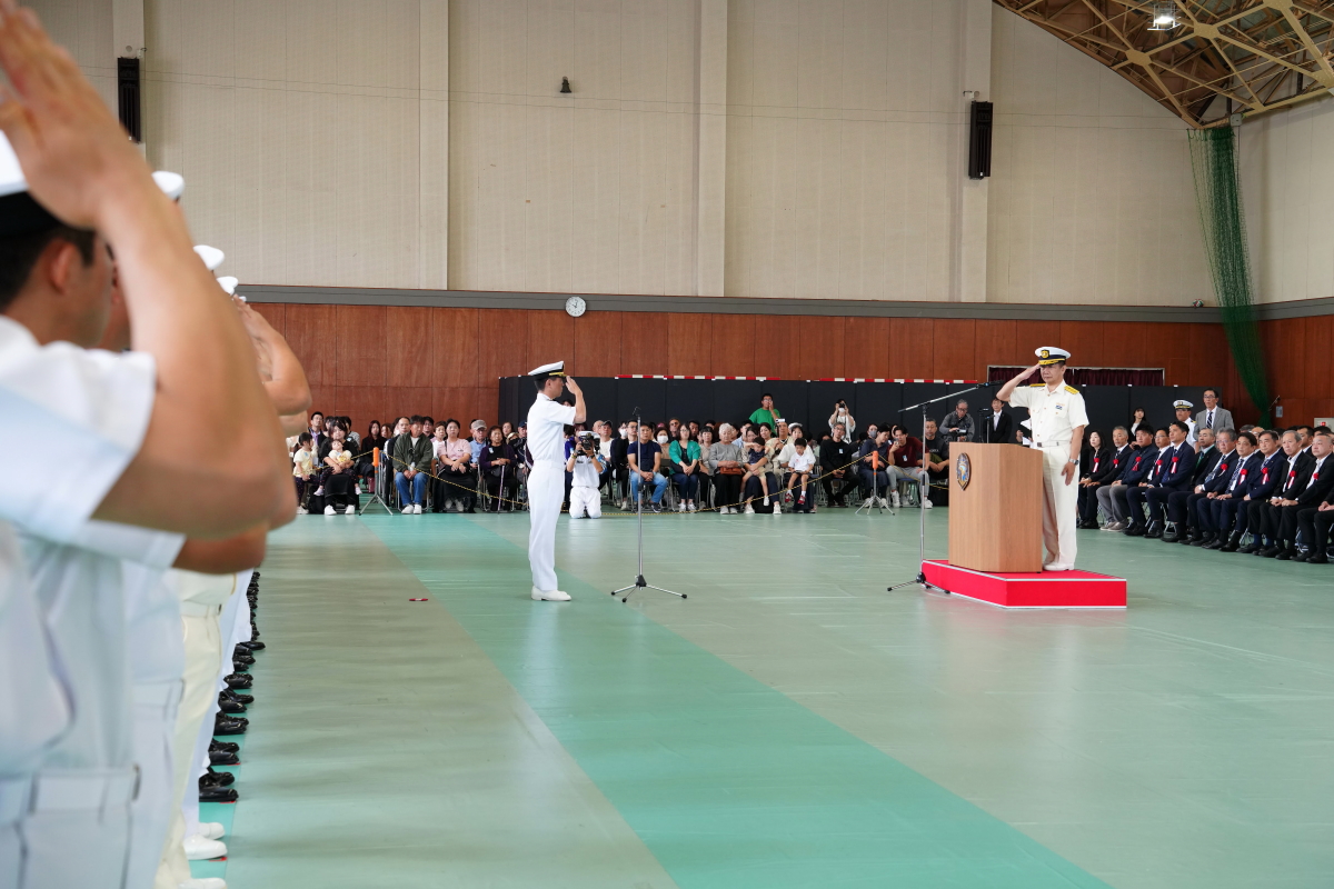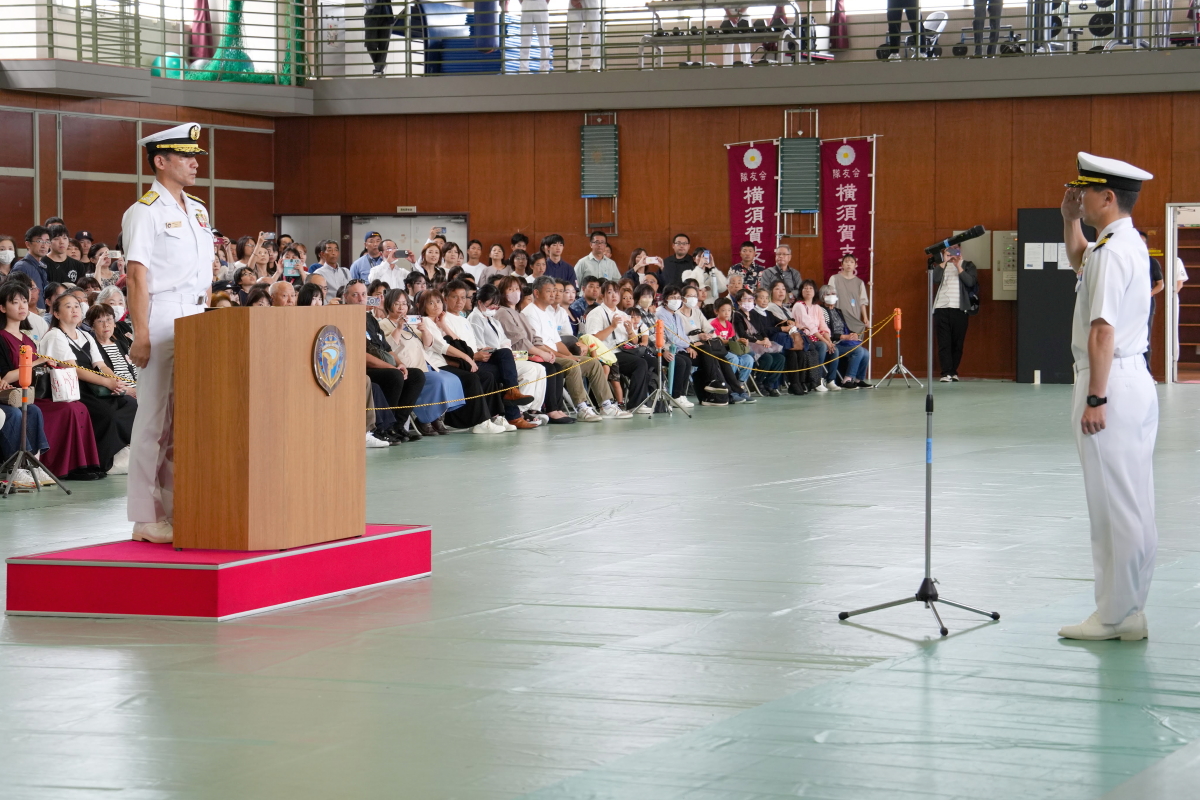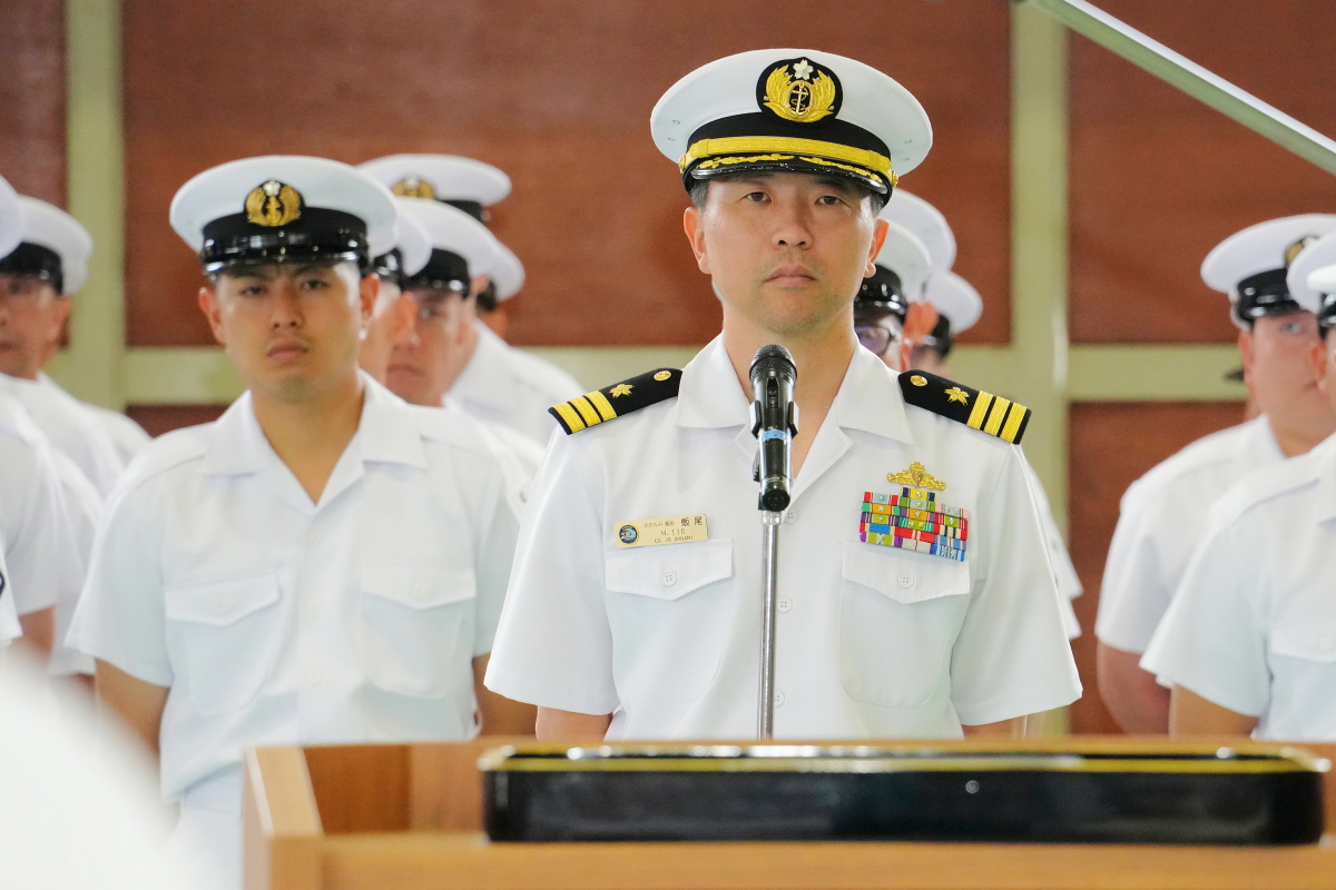 真殿知彦横須賀地方総監執行の出国行事は、大町克士自衛艦隊司令官訓示、彼末浩明海上保安監による来賓代表挨拶、来賓紹介等、おおなみ艦長の出国報告の順で実施されました。