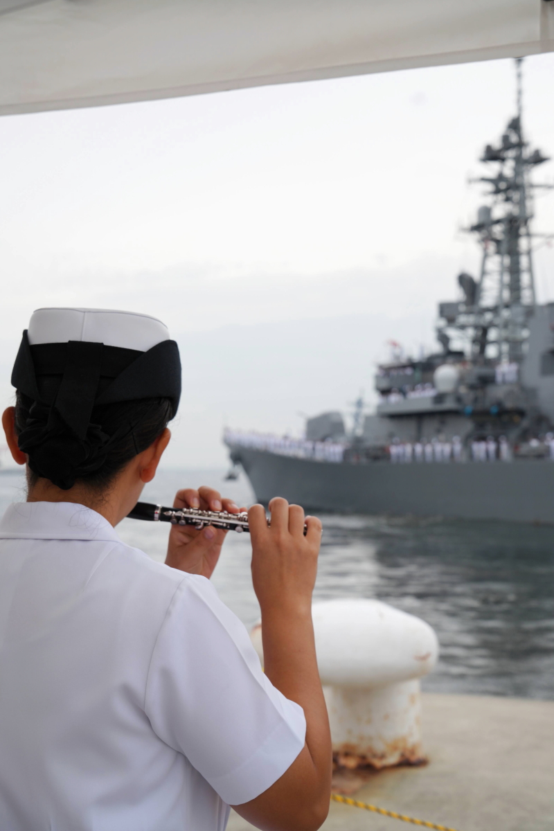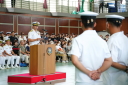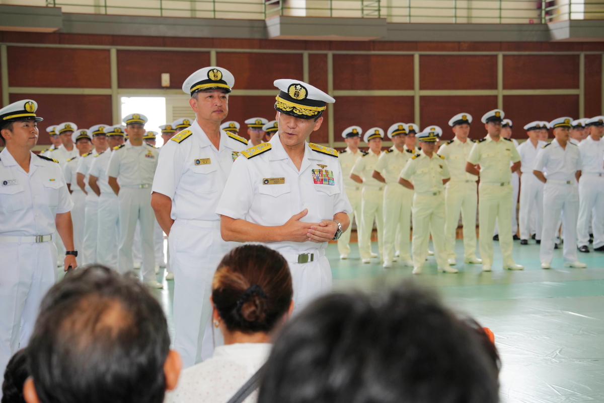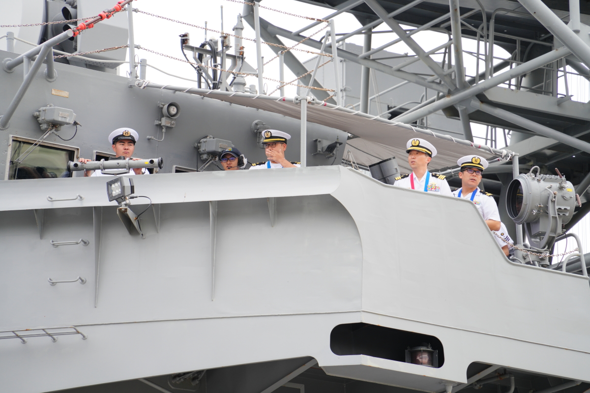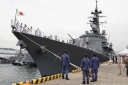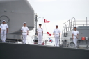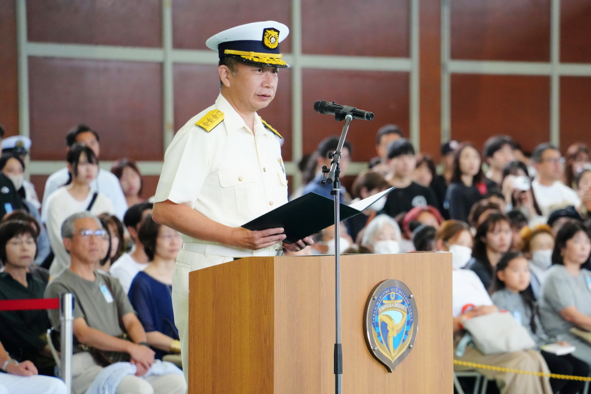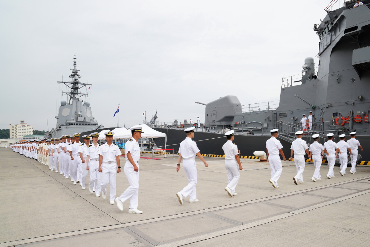 真殿知彦横須賀地方総監執行の出国行事は、大町克士自衛艦隊司令官訓示、彼末浩明海上保安監による来賓代表挨拶、来賓紹介等、おおなみ艦長の出国報告の順で実施されました。