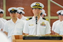 おおなみ艦長が「一致団結、任務に当たります。おおなみ出港します。」と力強く報告。