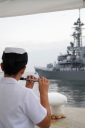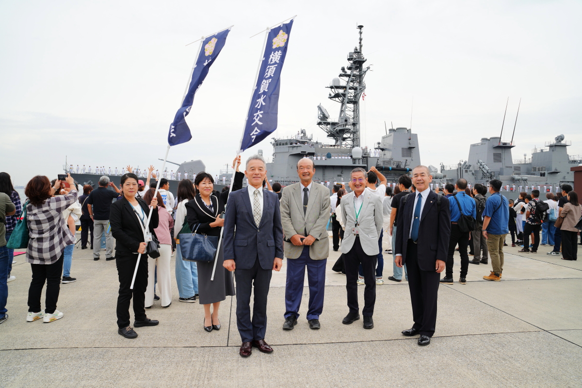 参会者の涙雨か、今にも泣き出しそうな空の下、「おおなみ」が岸壁を離れると、汽笛超長音が鳴り響き、乗員の帽振れに合せて、岸壁からの大きな声援が湾内を埋め尽くすなど、心に残る行事となりました。私たちも水交会旗を掲げ、派遣部隊の壮途を祝しました。