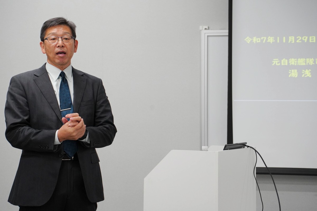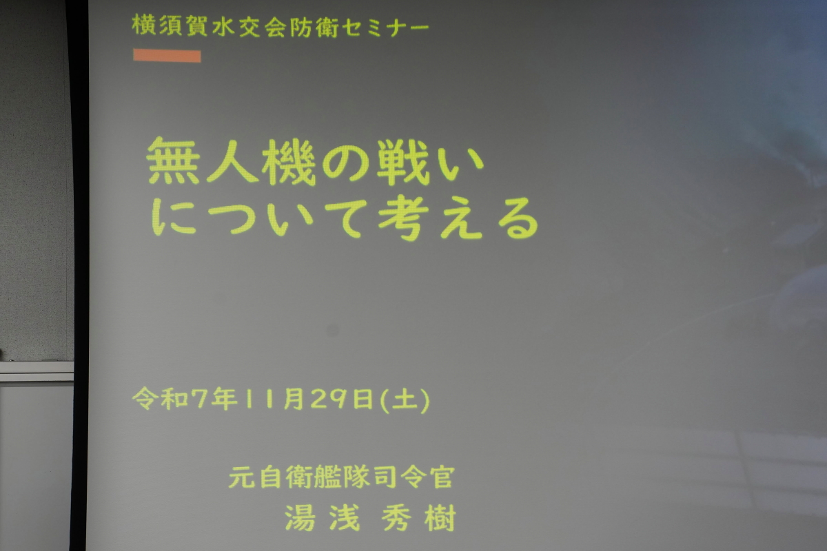 令和7年11月29日(土)、ヴェルクよこすか(横須賀市日の出町)において、「第7回横須賀水交会防衛セミナー」が開催され、約30名の会員等が参加しました。 今回の講師は、元海上自衛隊自衛艦隊司令官 湯浅 秀樹 氏(防衛大学校30期生)で、「無人機の戦いについて考える」と題して講話していただきました。