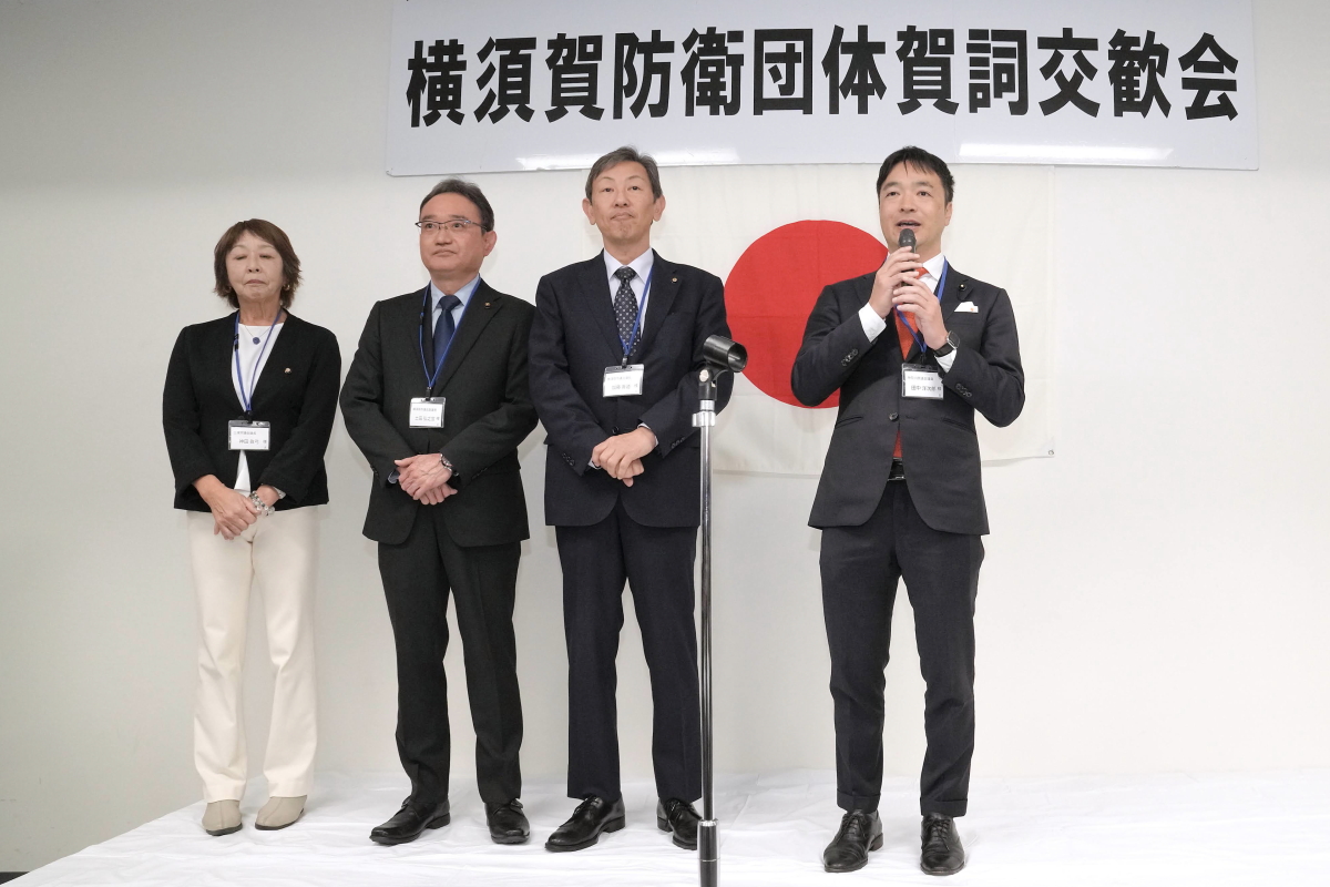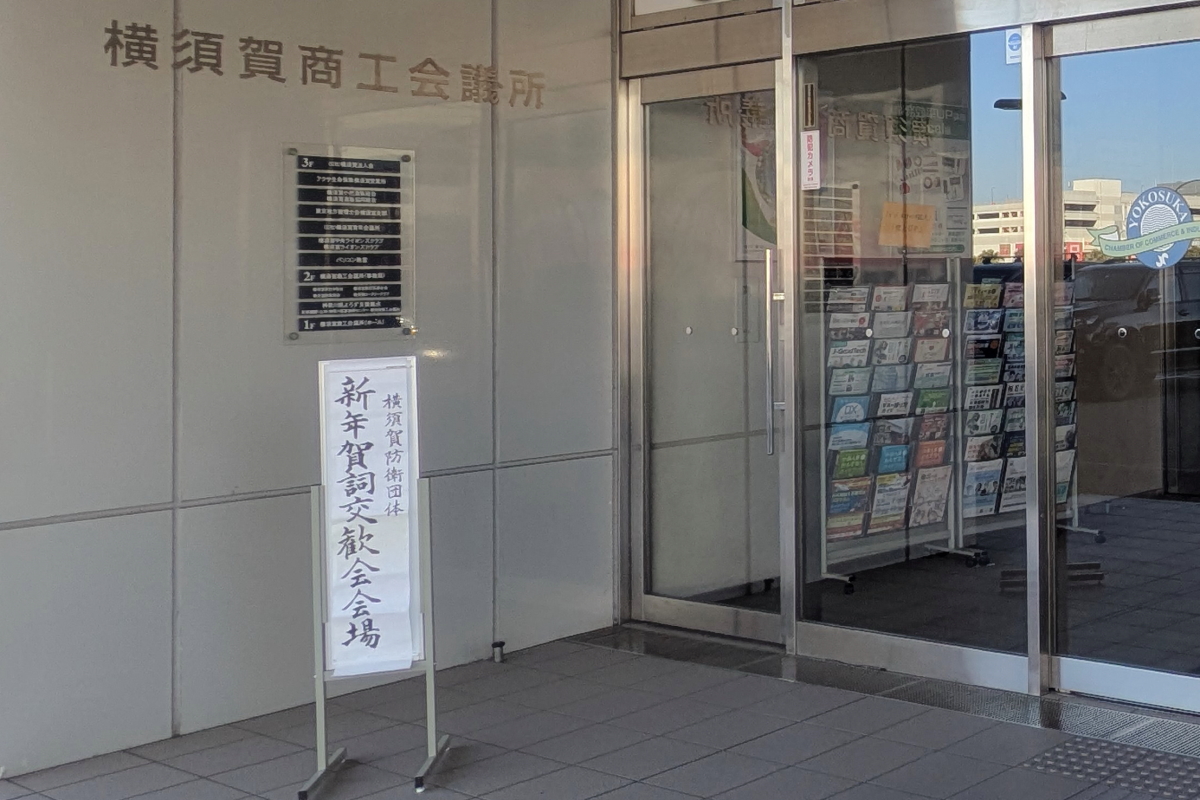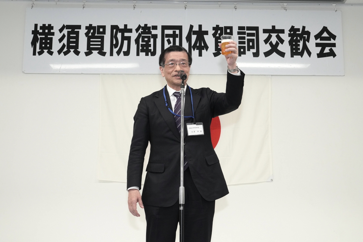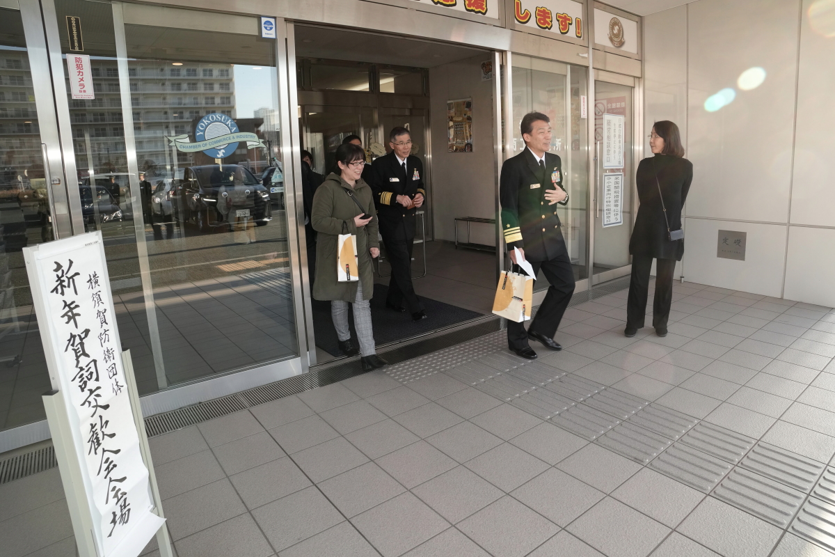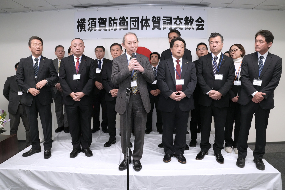 令和8年1月17日(土)、冬日和の優しい日差しの下、横須賀防衛団体※共催(代表:平松廣司横須賀防衛協会会長)による「令和8年防衛諸団体新年賀詞交歓会」が横須賀商工会議所1階、多目的ホールにて開催されました。 本会は、横須賀地区に在籍する陸・海・空自衛隊の部隊等の長及び先任伍長のほか、国会議員、地方議会議員及び横須賀市長等を招いて新春の賀詞を交歓するとともに、自衛隊を激励し、併せて、各団体で会員相互の親睦を図ることを目的として開催しているもので、今年も会場に入りきれないほどの参加者が集いました。